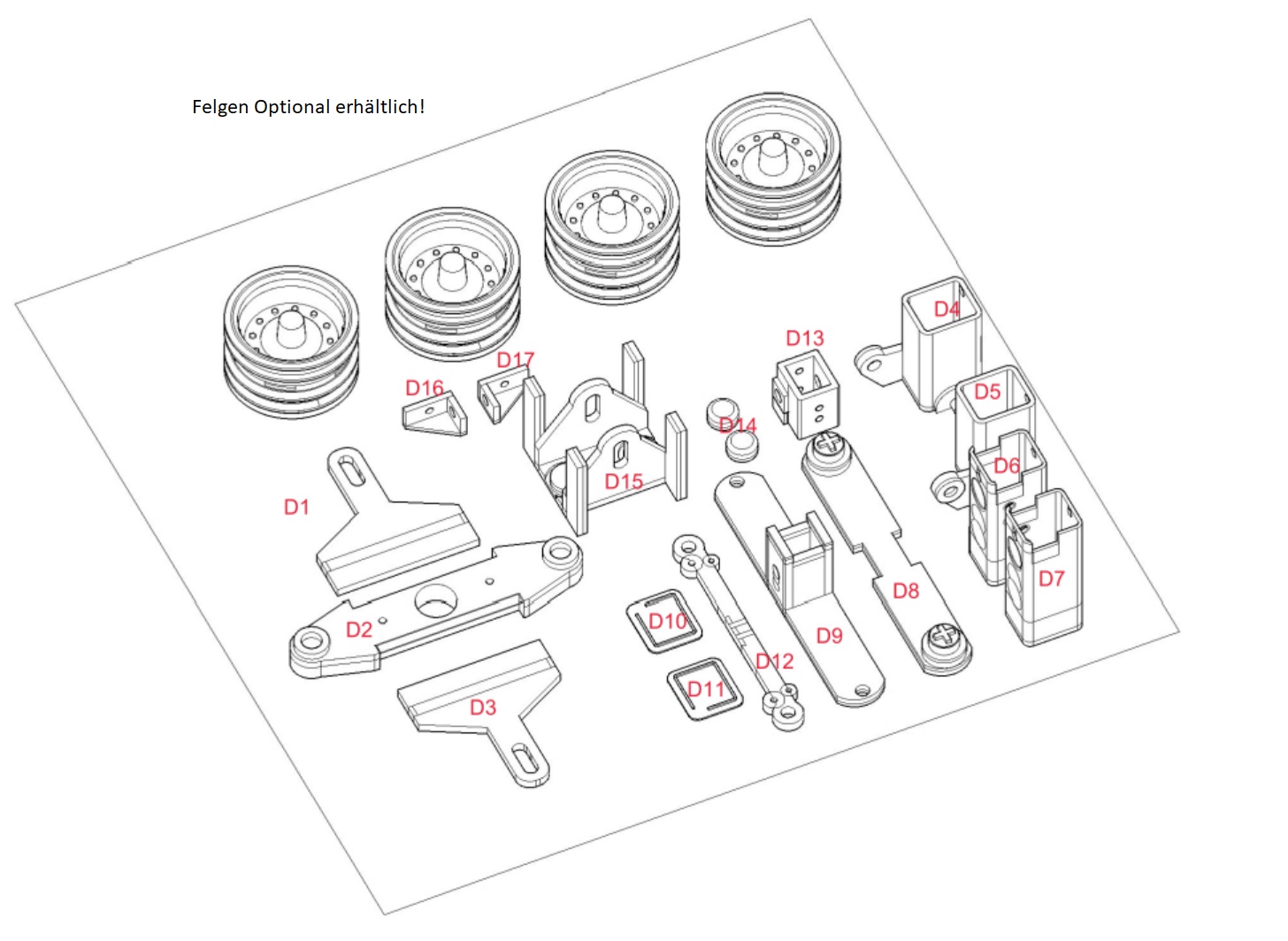 Das auf dem Foto abgebildete Fahrzeug, Felgen und Motoren gehört nicht zum Lieferumfang und zeigt nur die Einbaupositionen. Bausätze sollten keinen Temperaturen >40°C ausgesetzt werden.