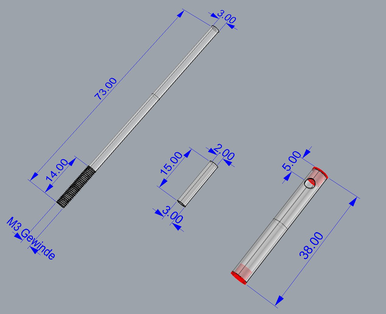 Die Welle ist 73mm Lang und 3mm im Durchmesser. In dem Stevenrohr ist eine Bohrung zum anbringen eines mitgelieferten Schmiernippel von 3x15mm.